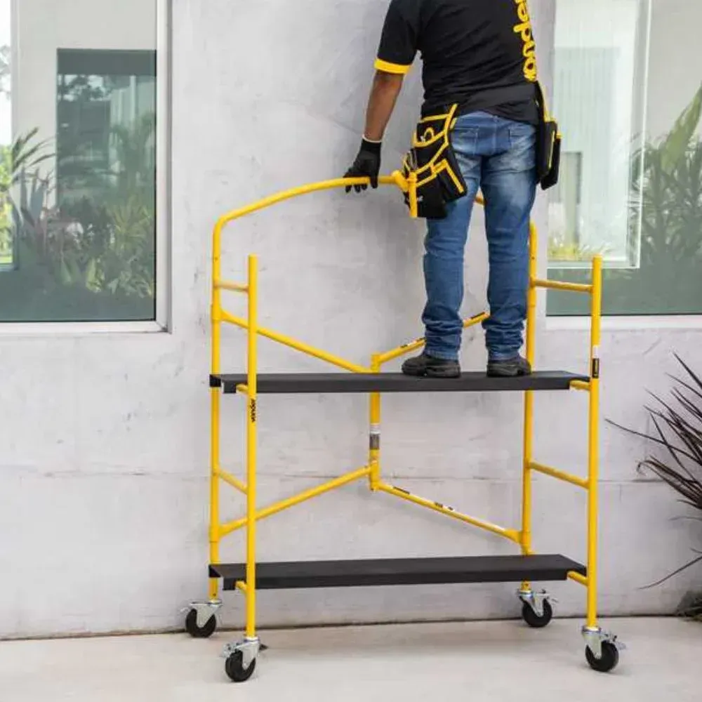 Possui barra de segurança que ajuda o operador a manter o equilíbrio, diminuindo o risco de quedas. Estrutura dobrável para facilitar o transporte e armazenamento. Conta com plataformas em aço com pintura antiderrapante e estrutura pintada a pó, que garante maior durabilidade.