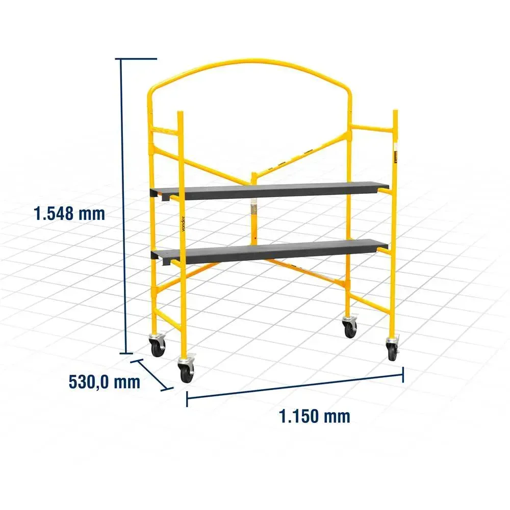 Acompanha 1 Plataforma dobrável portátil, acompanha: 2 plataformas de aço, 1 guarda corpo e 4 rodízios.